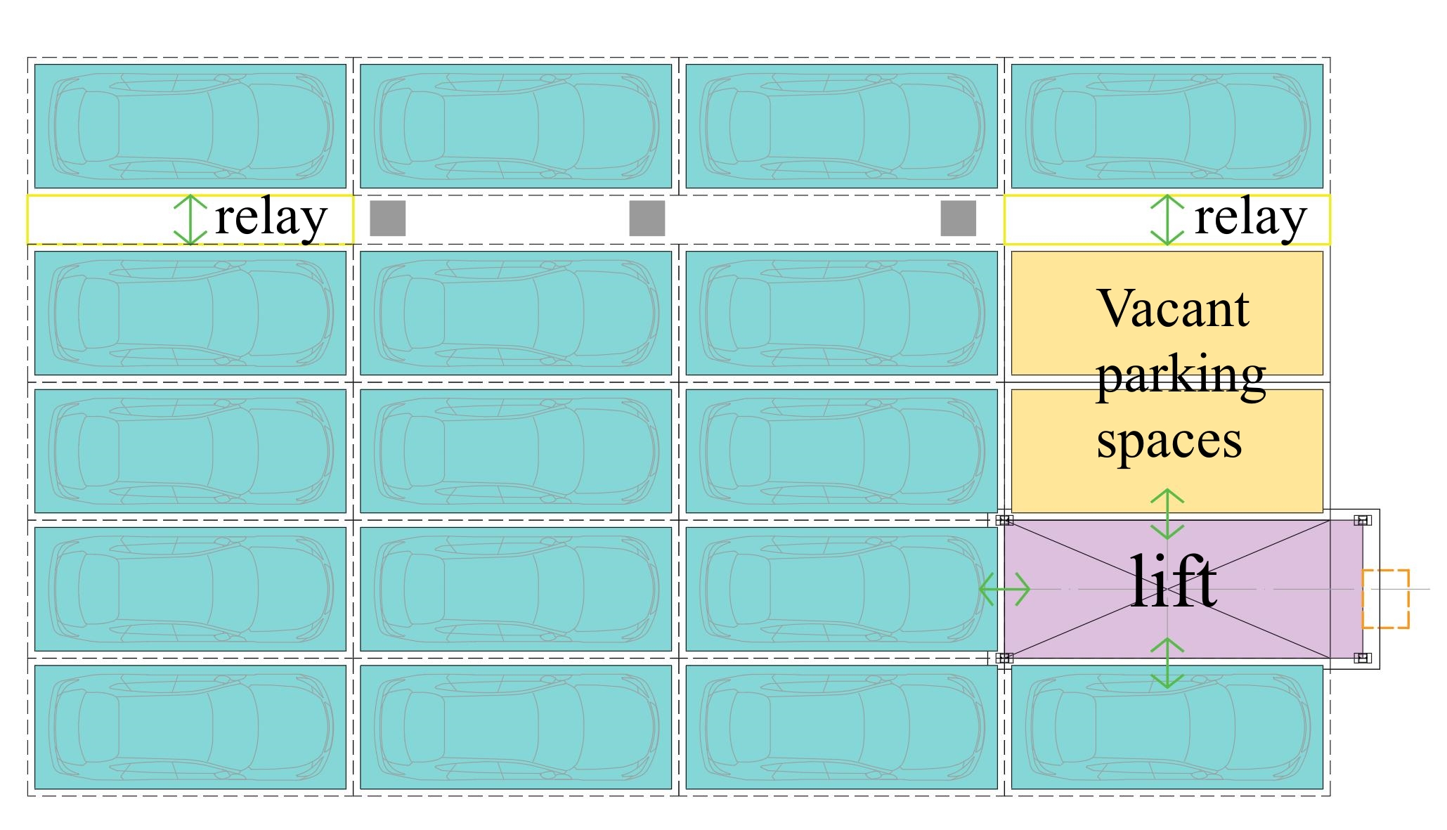 The same power units are set up at all positions on the plane. Each power unit can move the vehicle carrier/vehicle forward and backward or left and right. When encountering building columns or other structures, a relay unit is used to connect the power units, which will not affect the movement of the vehicle carrier.